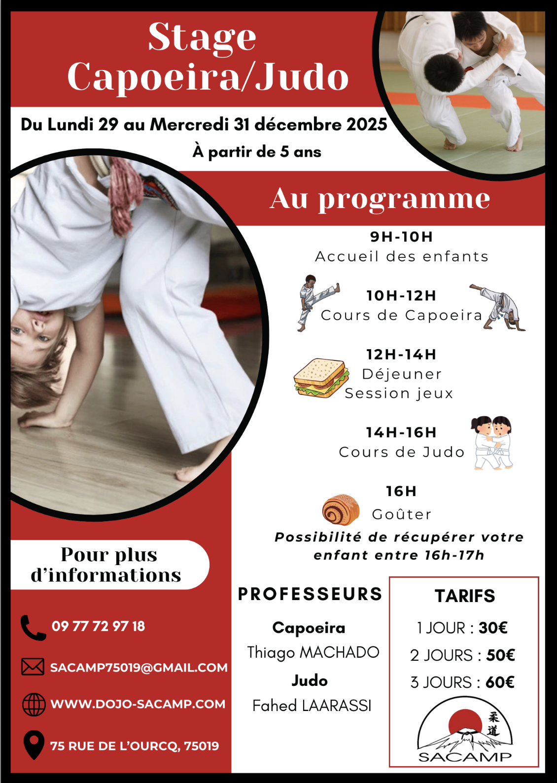 La Sacamp organise un stage de capoeira/judo du lundi 29 décembre au mercredi 31 décembre pour les enfants à partir de 5 ans.