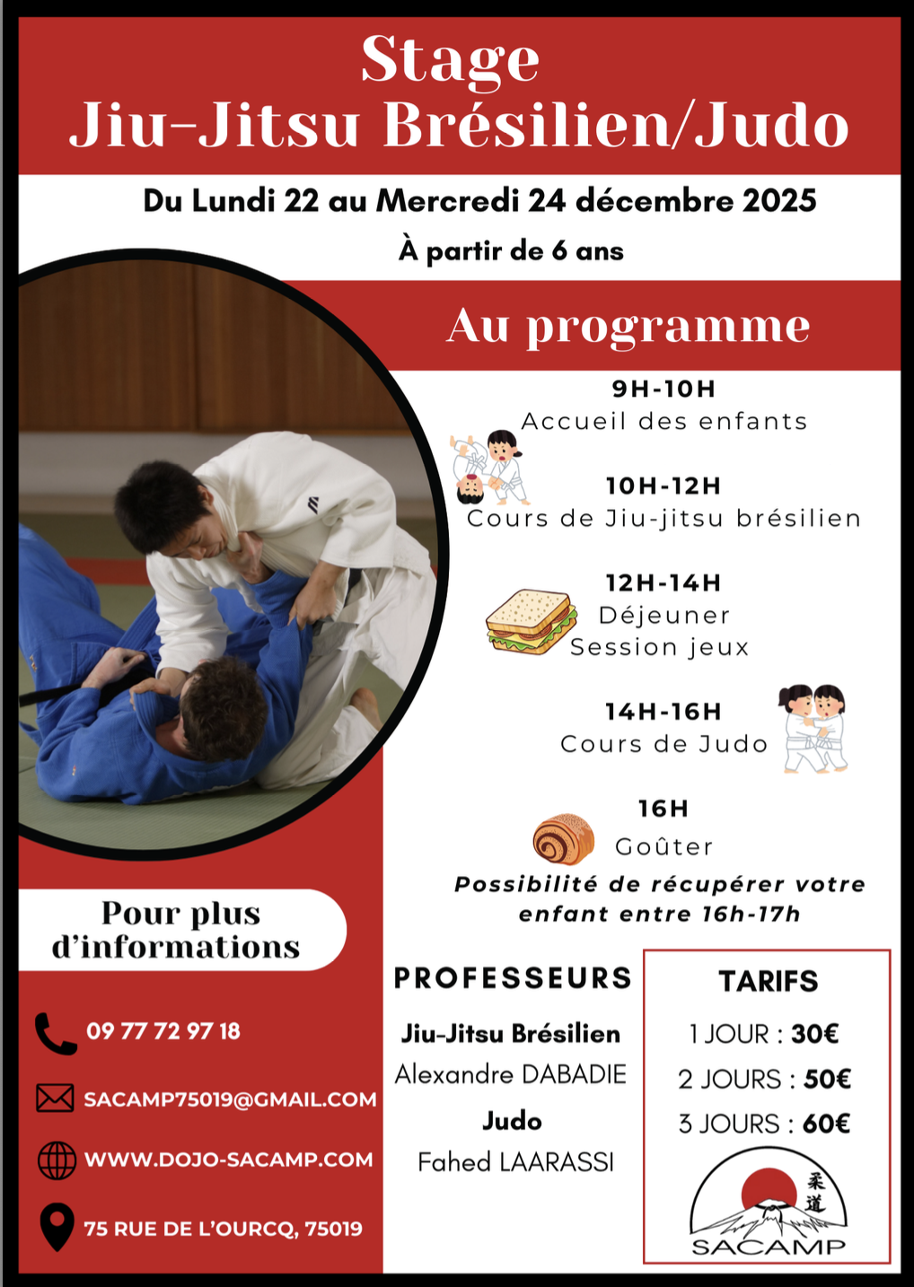 La Sacamp organise un stage de jiu-jitsu brésilien/judo du lundi 22 décembre au mercredi 24 décembre pour les enfants à partir de 6 ans.